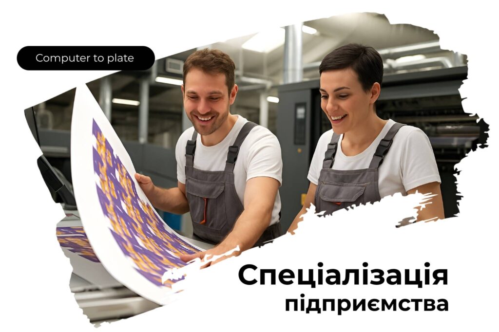 Професійна спеціалізація підприємства це надання послуг з виготовлення друкарських форм для листового та рольового офсетного друку використовуючи технологію “computer to plate”.